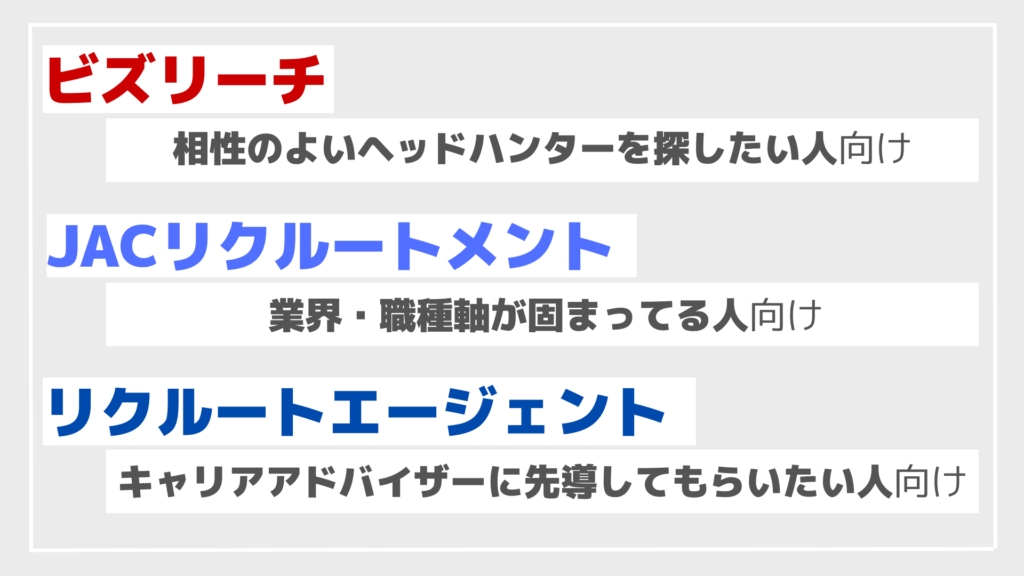 | ビズリーチ | JACリクルートメント | リクルートエージェント | |