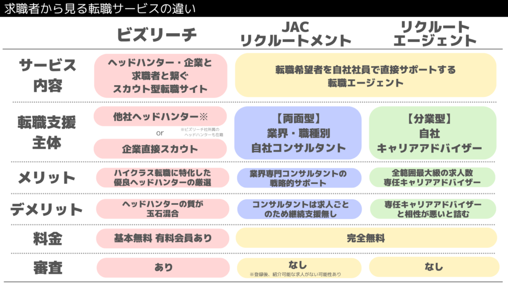 JACリクルートメント・リクルートエージェントは転職希望者を直接サポートする転職エージェントであり、ビズリーチは他社転職エージェントや企業と転職希望者をマッチングさせるスカウト型転職サイトです。